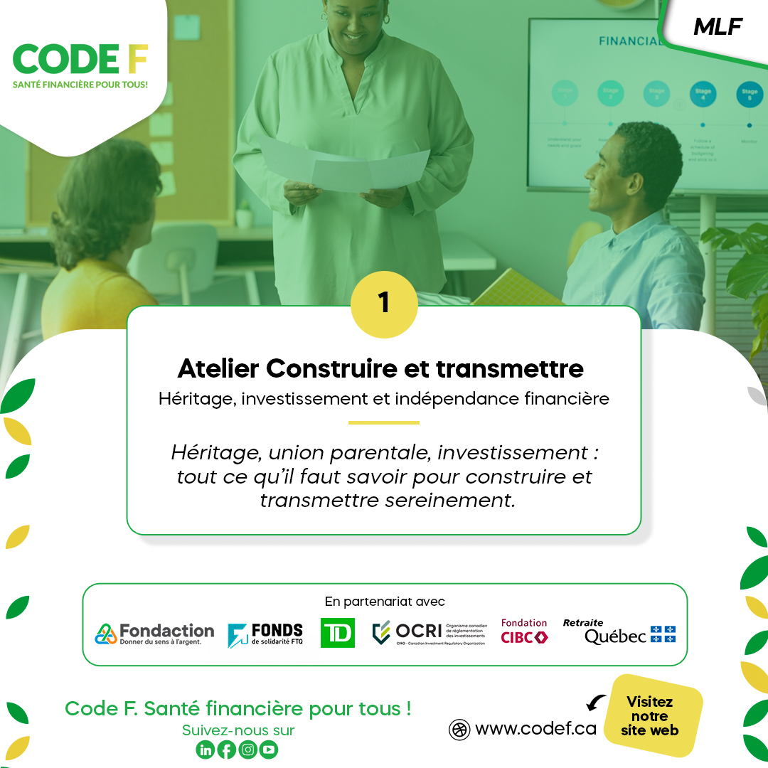 Participez à un webinaire exclusif organisé par Code F. dans le cadre du Mois de la littératie financière, et profitez d’une occasion unique d’en apprendre davantage sur la gestion de vos finances, la protection de votre patrimoine et la transmission familiale. Cette soirée interactive est conçue pour vous donner des outils concrets, des conseils de