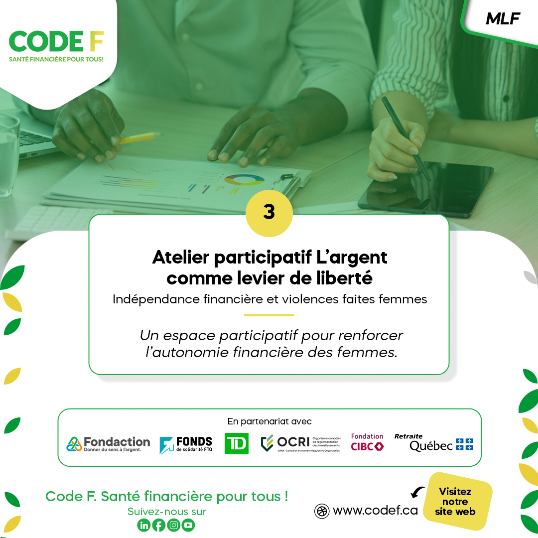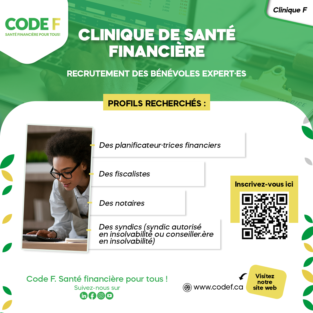 Dans le cadre du Mois de la littératie financière (MLF) 2025, Code F. organise la Clinique F le 15 novembre 2025 (en mode hybride, présentiel et virtuel). Cet événement vise à offrir à la population un accès gratuit à des conseils financiers personnalisés dispensés par des expert·es bénévoles. Objectifs de la Clinique F : Favoriser l’inclusion financière en rendant accessibles des conseils de qualité. Outiller les