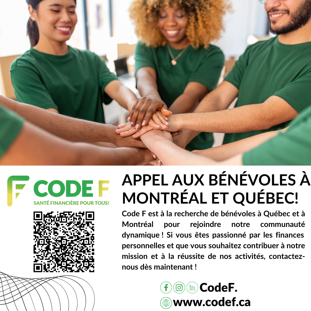 Code F. Santé financière pour tous! est à la recherche active de nouveaux.lles bénévoles pour la saison 2024-2025 qui débutera en septembre prochain et se terminera en juin de l’année suivante. Ceci afin de nous aider dans l’organisation de nos activités et événements.
