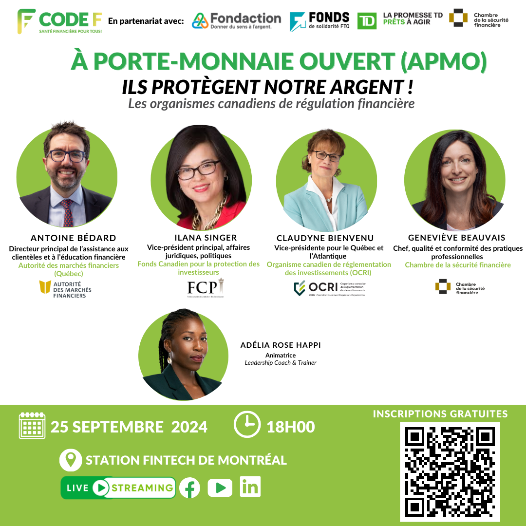 Montréal, le 07 août 2024 — Ayant à cœur d’éduquer, d’accompagner et d’outiller les individus pour la bonne compréhension et gestion de leurs finances personnelles, Code F vous invite à un panel de discussion, dans le cadre de ses Rendez-Vous « À Porte-Monnaie ouvert (ÀPMO) ». Ayant