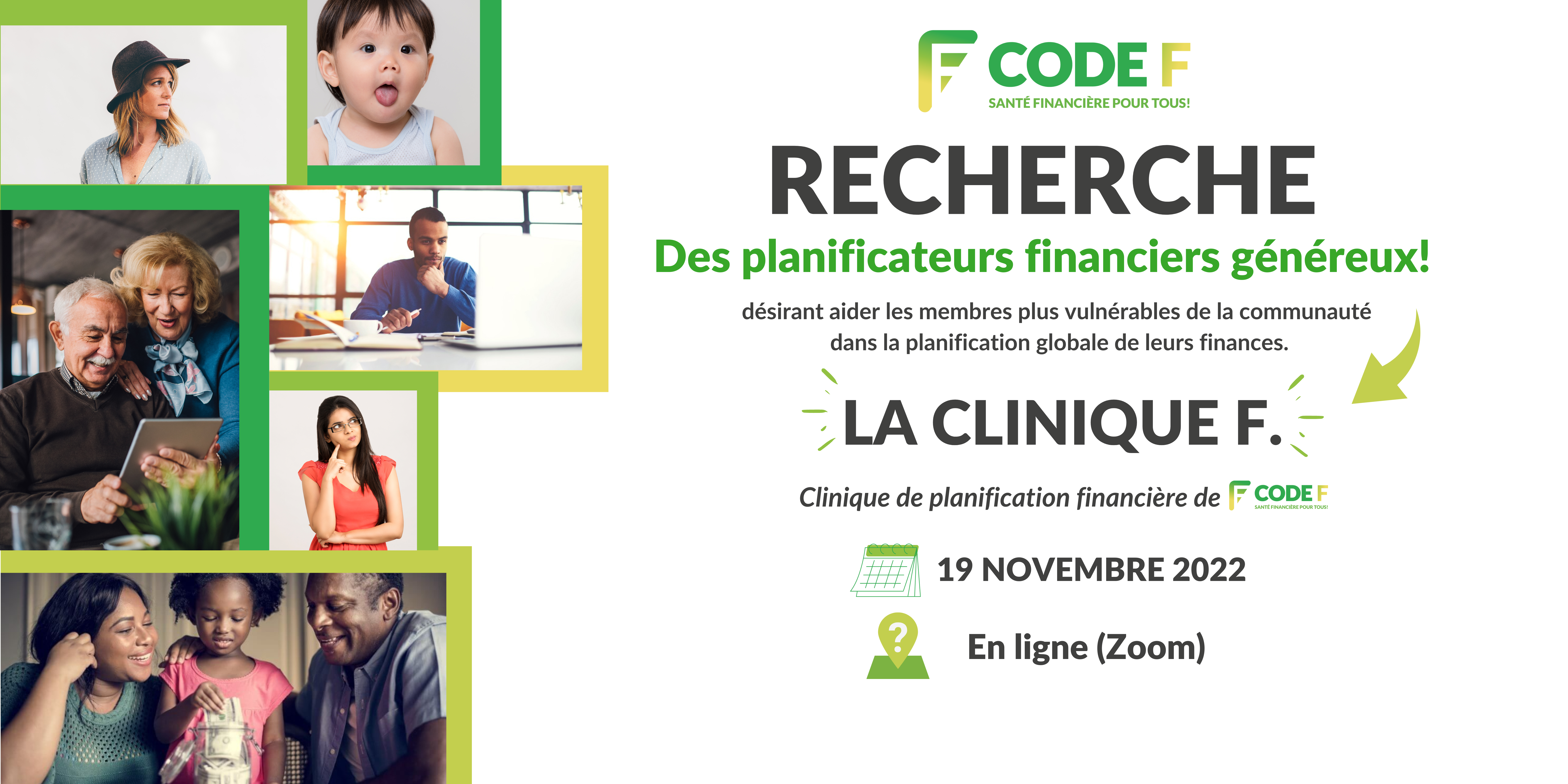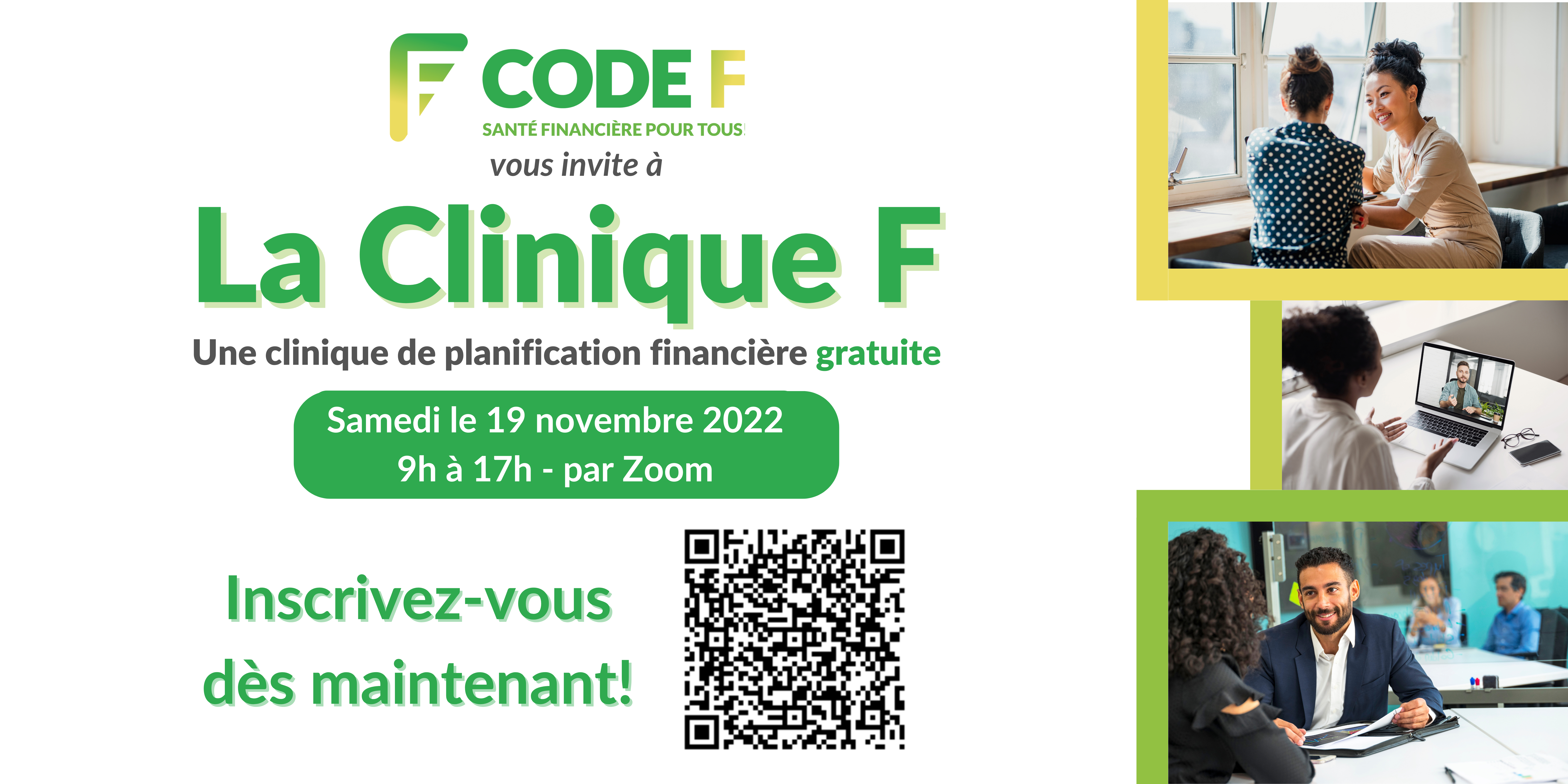 Dans le cadre du mois de la littératie financière, une des activités organisées par Code F. est la clinique F, une clinique de planification financière gratuite. Celle-ci se déroulera individuellement et sécuritairement sur la plateforme Zoom le 19 novembre 2022, en matinée comme en après-midi. Ça vous intéresse? Cliquez ici pour remplir le formulaire d’inscription. Entretemps,