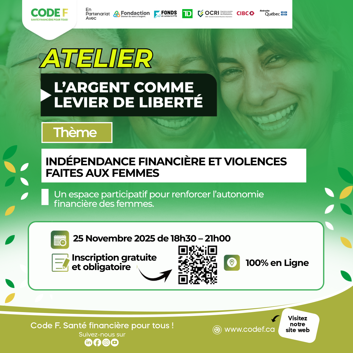 Participez à un webinaire exclusif organisé par Code F. à l’occasion de la Journée internationale pour l’élimination de la violence à l’égard des femmes, et profitez d’une occasion unique d’en apprendre davantage sur l’indépendance financière des femmes et la prévention de la violence économique. Cette soirée interactive, 100 % en ligne, est conçue pour vous donner des outils concrets, des conseils pratiques et des stratégies pour renforcer votre autonomie financière.
